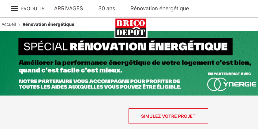 C’est astucieux ! Il y a désormais un service Rénovation Energétique des plus complets sur le site Brico Dépôt, avec audit, devis avance de primes, travaux RGE et même certification du boulot… Sauf que c’est en réalité signé Ynergie. sous le haut patronage de Brico Dépôt