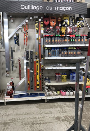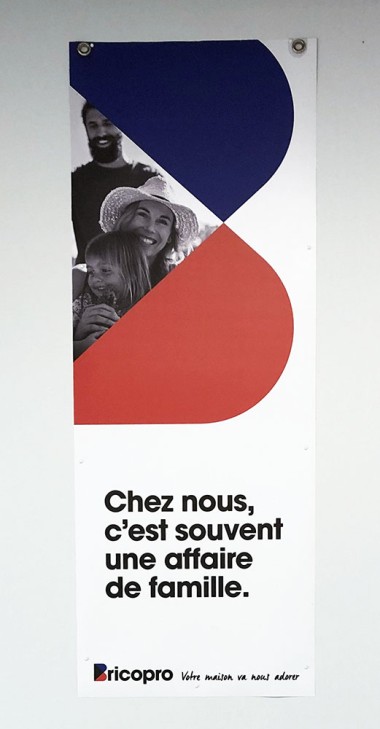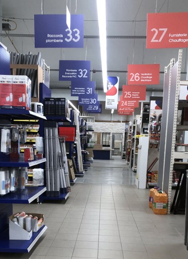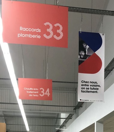 Chaque rayon est très précisemment indiqué. En revanche, pas de grands panneaux de secteurs. On retrouve l'alternance rouge et bleu de la signature d'enseigne qui rythme les univers ou tout simplement, le côté droite ou gauche des allées. Les grands panneaux sont utilisés pour insister sur l'âme de Bricopro sur le thème du "Chez Nous" déclinés en sauce de proximité : "entre voisins on se tutoie facilement", " c'est souvent une affaire de famille", il n'y a pas de petits projets" etc.