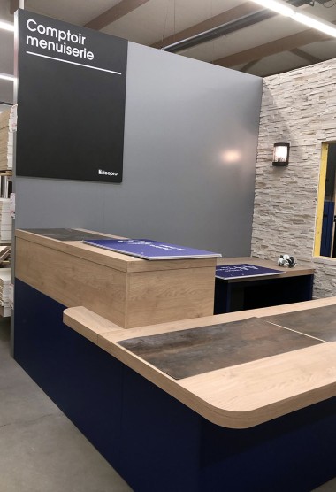 Les secteurs sont rythmés par des comptoirs qui mettent bien en avant la signature de l'enseigne avec en dos un tableau indiquant le nom du secteur et ce que le respeonsable veut bien rajouter. Côté menuiserie, on ne retrouve que le tableau noir ... c'est le show room qui fait office de lieu convivial. Le système est donc adaptatif.