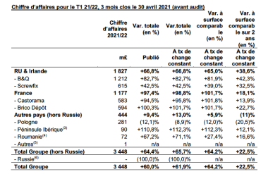 Petit rappel d’abord : le premier trimestre de Kingfisher commence au 1er février et s’achève au 30 avril. On savait que les résultats des premiers trimestre 2021 allaient nous réserver des surprises puisqu’ils allaient prendre comme élément de comparaison le fameux mois de mars 2020 de désert commercial quasi total. Et ça n’a pas loupé avec un Casto qui atteint +101,7 % et Brico Dépôt + 101,8 % Le chiffre d’affaires total Groupe, lui, est en hausse de 64,2 % à taux de change constant et s’établit à 3,4 milliards de livres sterling. Un faux bond mais une vraie progression car sur deux ans l’ensemble de Kingfisher a vu son CA grimper de 22,5 % . Royaume-Uni et France cartonnent même si les limitations de ventes du premier trimestre français ont freiné un peu cet envol. Quelque 26 magasins ont été impactés !