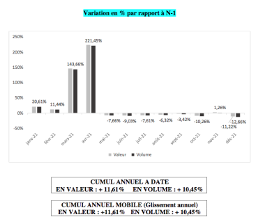 Pour le dernier mois de l'année, on s’attendant à une forte baisse puisque décembre 2020 avait cartonné à +31 % ! Et de fait décembre 2021 recule … mais de 11,22 % seulement. La correction est assez mesurée.