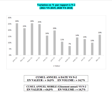 Au final , l’année 2021 se termine avec une hausse à deux chiffres de 11,6 % en valeur comparé à 2020 et de près de 17 % (16,9) comparé à 2019.