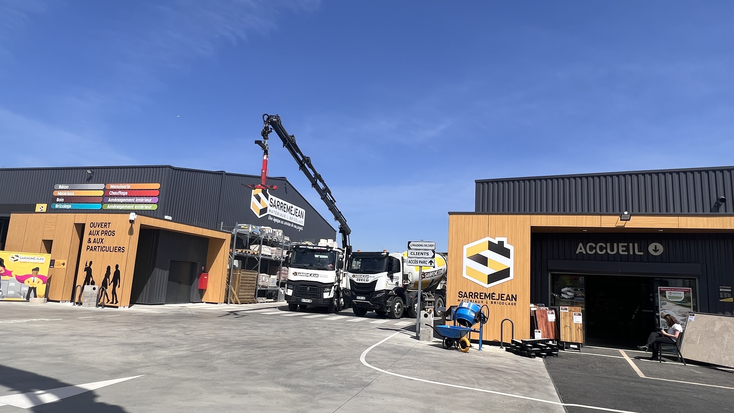 Charles-Gaël Chaloyard, directeur de l’enseigne Tout Faire a fait le déplacement même si le magasin ne porte pas l’enseigne « Tout Faire », le groupe n’en reste pas moins un adhérent de référence. Jean-Luc Guéry, président d’Inoha mais aussi du Medef 47 est là aussi… en voisin car Optimum qu’il dirigeait et qu’il conseille est à quelques centaines de mètres du nouveau négoce. Parmi les invités, on compte bien sûr les élus locaux comme Frédéric Péchavy, président de la CCI, ou Jean-Marc Gilly, maire d’Estillac. L’équipe du négoce composée de 6 personnes est dirigée par Eric Lamothe qu’on a connu chez Labenne Rougier Gedimat du Lot-et-Garonne. Et il n’est pas venu seul ! Le négoce est composé de plusieurs bâtiments : un premier pour le libre-service et le show room avec une surface assez mesurée et un immense entrepôt (2500 m2) de stockage mais traversant en camionnette/camion. Tout est fluide , on dirait un immense drive à plusieurs entrées . « Nous savons que le temps des professionnels est précieux , explique Laura Sarraméjean, c’est pourquoi nous avons développé des services pour faciliter leur quotidien au maximum » L’entreprise assure d’ailleurs les livraisons sur chantier en s’appuyant sur une flotte de 48 camions et propose 5 centrales à béton mais qui sont pour l’instant concentrées sur le Gers et les Landes voisins.