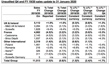 Afficher une progression de CA quasi identique à celle de Kingfisher Pologne (+3,4 %) il y a bien longtemps que ce n'était pas arrivé à Kingfisher France. Il faut dire que le marché du bricolage au sens large a progressé mais il fut un temps pas si lointain où le groupe perdait des parts de marché justement pendant ces périodes fastes. Là, ce n'est pas le cas et Kingfisher l'explique par la réintroduction de ces bonnes vieilles opérations commerciales qui boostent le chiffre. Le tandem Thierry Garnier - Alain Rabec, tout deux ex-Carrefour et respectivement patrons de Kingfisher monde et France ont privilégié le commerce. L'effet est là même s'il est probable que ces mois de vente auront moins délivré de la "value". Le groupe au sens large a connu une progression au dernier trimestre de 1,7 %. Si les premières semaines de l'année 2020 étaient prometteuses ( l'exercice commence au 1er février pour Kingfisher), la crise du Covid a mis un énorme coup de frein (sauf aux ventes en ligne qui ont bondi) : entre le premier février et le 21 mars les ventes de Castorama et de Brico Dépôt ont fortement varié de +8 % ,6 % en février à - 97 % à la troisième semaine de mars ! (source Kingfisher)