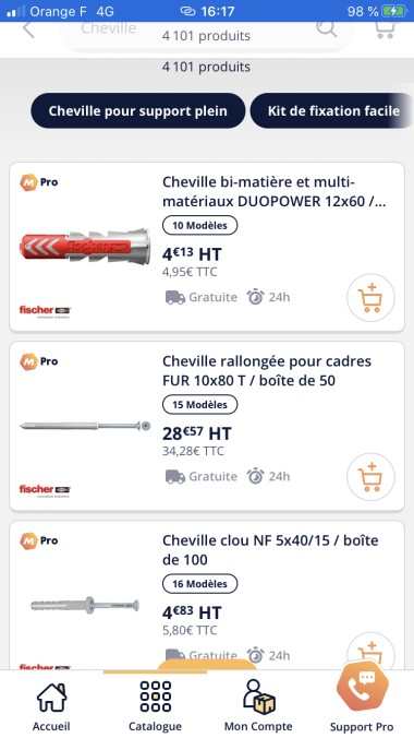 Les produits proposés sont classés selon un algorithme "maison" qui inclut les produits préférés par l’ensemble des clients Mano Mano, vos propres habitudes et surtout l’appartenance du produit au catalogue Pro. Cette appartenance est d’ailleurs marquée par un logo « M pro » orange et noir. Ainsi l’artisan a le choix des 5 millions de références du catalogue Mano Mano mais avec des prix affichés en hors taxes et les 35 000 références du catalogue Pro que Lorraine vante comme étant le lieu « des produits sélectionnés pour leur qualité pro. » Sélectionnés par qui ? « Par notre équipe qui sont tous des anciens de Point P , Cedeo et autres Rubix. » Mais de quelle qualité parle-on ? Les produits sont-ils testés ? « Non, explique Lorraine Valsasina mais aux vues des marques de référence du catalogue vous savez que c’est de la qualité… il n’y a aucun doute. Cela dit nous suivons les retours et les avis pour voir s’il n’ya pas de problème » En revanche, la qualité de livraison, elle, est le véritable sésame pour faire partie du catalogue. Et notre interlocutrice de prendre l’exemple d’une cheville Fischer « que vous pouvez trouver en catalogue pro ou en B to C. En catalogue pro il y a un franco possible à partir de 250 €, un meilleur prix, une livraison en 24 H (80 % du catalogue) et un tracking, alors que si vous la prenez en B to C ce ne sera pas le cas »