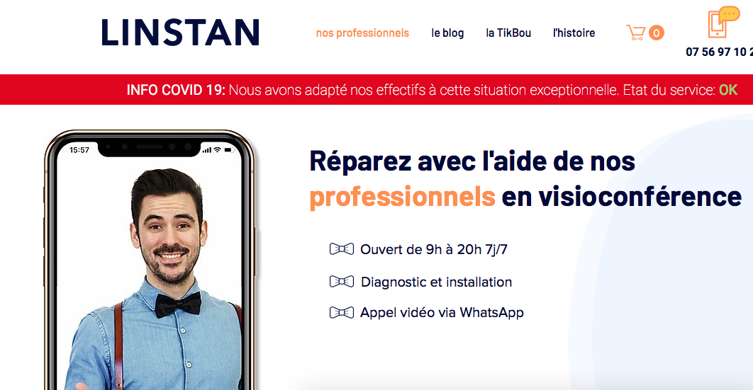 Pour Lindsay et Stanislas créateurs de Linstan, start-up incubée à la station F, cette crise est un opportunité de développer leur idée même "si on le regrette infiniment que ça se passe comme ça. On aurait préféré d'autres circonstances", expliquent-ils. En attendant leur idée tombe à pic Cette idée est venue quand "Stan qui est plombier de métier est parti en déplacement à Paris. Je me suis retrouvée seule à Biarritz avec une panne de pression d'eau et il est intervenu par vidéo pour m'expliquer comment réparer moi-même. A son retour, on s'est dit : faut développer ce service". Le couple trouve le nom en associant la première syllabe de leurs prénoms. Linstan est né. Il faut maintenant construire le modèle. Il y aura des "helpers", ceux qui interviennent. ils sont artisans, pros depuis au moins 5 ans dans les domaines de la plomberie, électricité chauffage. Le helper reçoit des notifications comme un livreur Uber. Quand il prend en charge la commande, il touche 70 % de sa valeur. En revanche, il doit s'abonner à la plateforme pour 59€/mois. A ce prix il dispose d'une page Web dédiée avec carte de visite, une vidéo le présenatnt et une tenue de Helper Linstan à savoir chemise, noeud papillon et bretelles. Le helper peut aussi toucher une com sur les achats de produits qu'il déclenche.