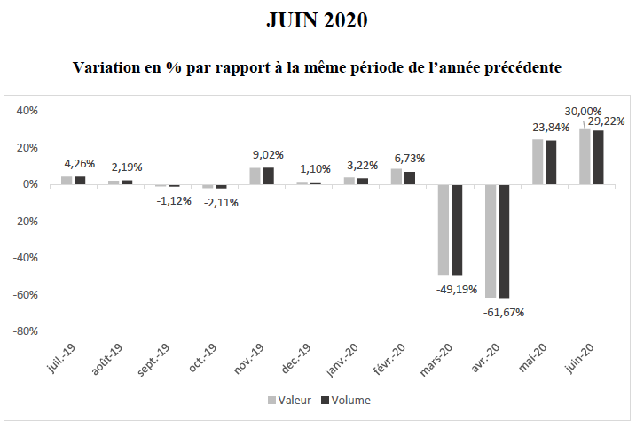 Avec -8,5 % en 2020 comparé à 2019, à la fin juin c'est plutôt une grande nouvelle alors que nous aurions du trembler d'effroi. L'indice de la banque de France/FMB des ventes brico en GSB avait plongé de 40 et 60 % en mars et avril mais depuis c'est la folie avec un mois de mai quasi à + 25% et +30 % en valeur en juin. Comme juillet s'est, parait-il, poursuivi à bon rythme on peut espérer que le retard est comblé. A noter qu'en cumul annuel glissant, le marché n'est plus qu'à -3,24 % en valeur. Dernier point la plupart des ventes ont été faites à prix fort...