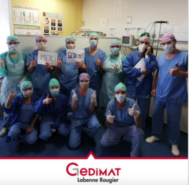 Vendredi 27 Mars 17H00 : GEDIMAT LABENNE ROUGIER FOURNIT DES LUNETTES AUX SOIGNANTS Le magasin Gedimat de Villenave d'Ornon qui appartient au groupe Labenne Rougier a donné ses lunettes de protection EPI à l'Hôpital Bagatelle de Talence proche de Bordeaux avec cette dédidace : "Immense merci à tout le personnel soignant en première ligne lors de cette épidémie ! 🙏" . Les équipes ont renvoyé cette photo de remerciements. Faute d'être au coeur de l'ouvrage puisque la plupart des chantiers sont arrêtés , Gedimat est au coeur du courage avec les urgentistes. Rappelons que le groupe devait tenir son salon d'enseigne pour la première année à Bordeaux mais avait finalement renonçé vue la montée en puissance du virus début ars.