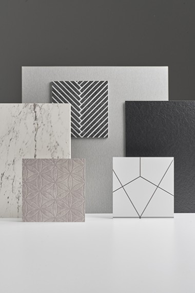 Cerise sur le gâteau, un Noyau Beige inédit intègre la batterie des Noyaux Blanc Froid, Blanc Chaud, Gris et Extra Noir. Là-encore, l'harmonie des décors et noyaux, associée au choix d'une structure, permet de réinterpréter la pierre, l'ardoise, le quartz ou encore le marbre... Si l'on prend par exemple le décor Boston, avec un Noyau Gris et une structure Extramat, l'impression de béton brut se révèle bluffante et donne aux réalisations un effet monobloc, sans joint visible.