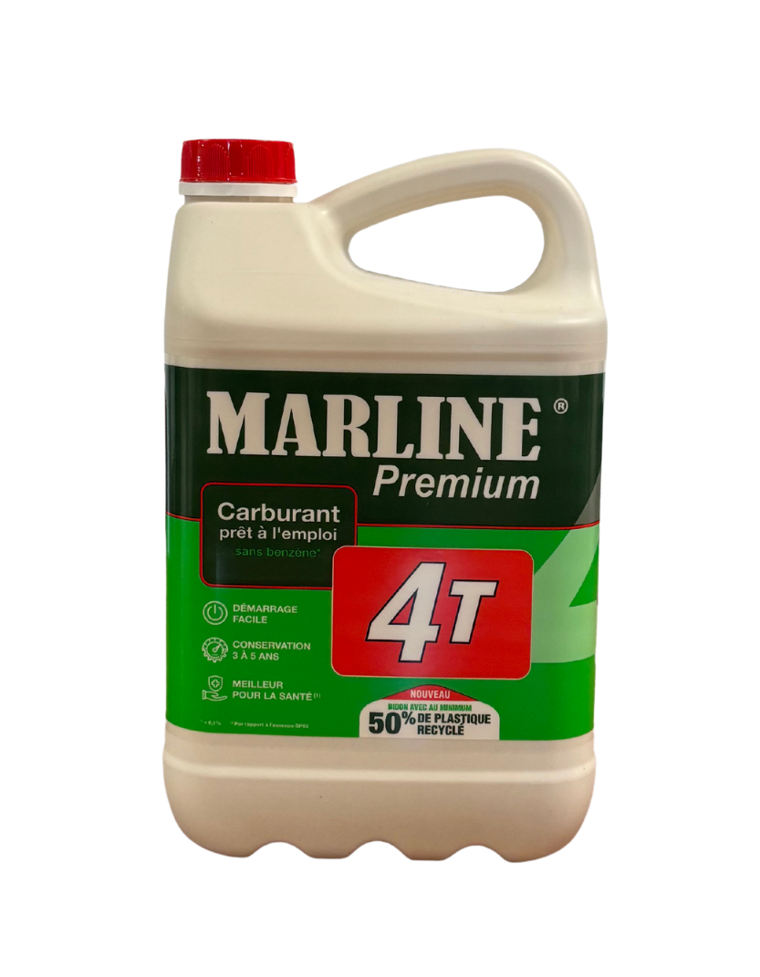 Marline annonce le lancement de bidons de 5 litres utilisant 50 % de plastique recyclé, avec un objectif de 100 % courant 2025 ! Autre voie utilisée : la réduction de la quantité de plastique utilisé dans la fabrication des bidons de 5 l Marline Premium 2 Temps et 4 Temps, Classic 2 Temps et 4 Temps et Marline HVO passant de 200 g à 180 g. Cette première étape initiée en 2024 se poursuit avec des bidons de couleur beige qui annoncent qu’ils sont 50 % en matière recyclée. L’ensemble de la gamme reste en PEHD* 100 % recyclable.