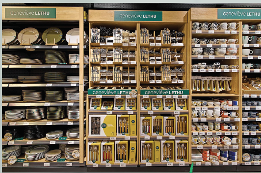 L’idée de la marque est de proposer « une belle table 365 jours par an » et mise donc sur « des designs qui sortent du lot ». Le repositionnement du prix se traduit par 80 % de l’offre unitaire à moins de 6,99 €. C’est un peu du Genevève Lethu pour tous et disponible dans les lieux fréquentés régulièrement par les Français.