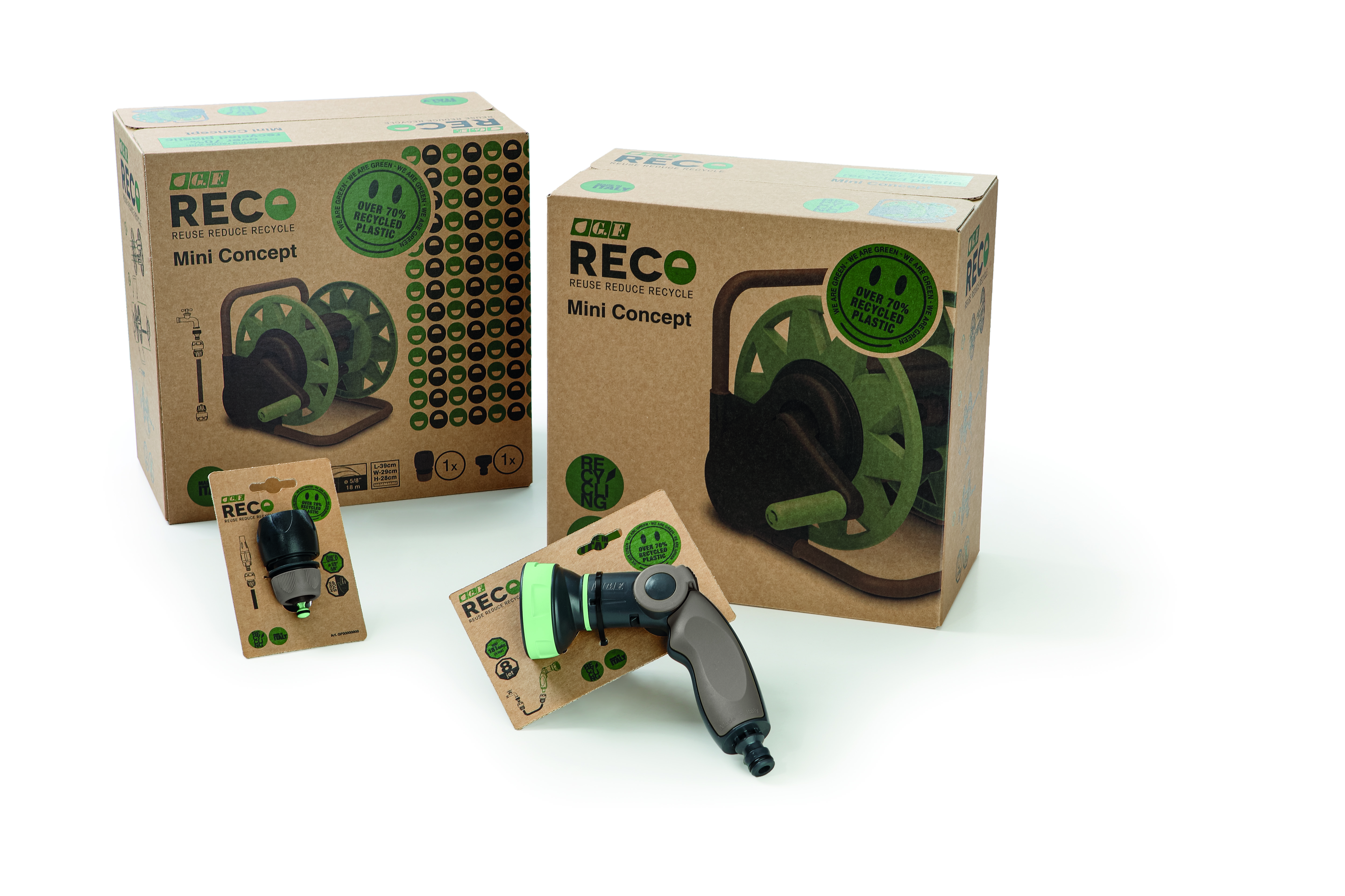 Réutiliser et recycler... Les produits de la nouvelle gamme Reco sont créés à partir d'ABS provenant des déchets des poubelles mais aussi des propres déchets industriels de la société C.F. Re-traité, l'ABS est transformé en matière première réutilisable pour fabriquer une gamme de produits d'arrosage complète incluant des raccords, des lances, des pistolets, des dévidoirs ou des systèmes d'irrigation goutte-à-goutte, intégrant plus de 70 % de plastique recyclé. L'un des produits phares de cette gamme est une douche solaire réalisée à partir de plus de 20 % de plastique recyclé et écologique puisqu'elle chauffe l'eau grâce au soleil.