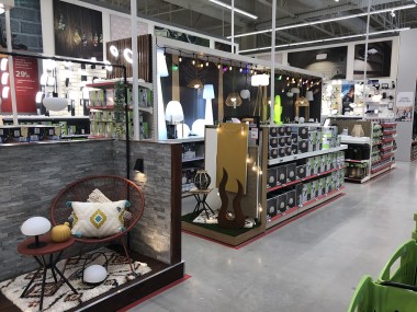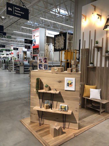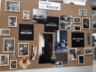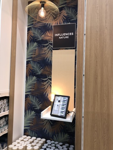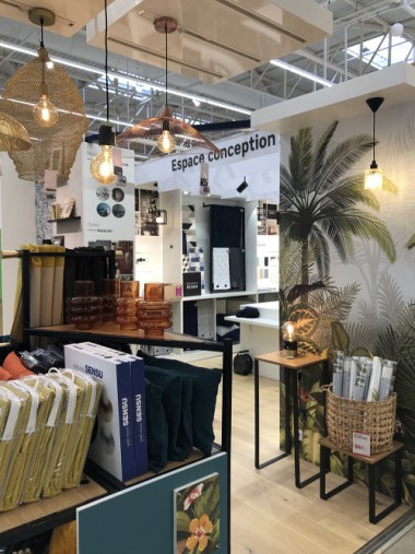 Le magasin commence avec le rayon luminaires, puis les cadres, les voilages, la peintures etc. A droite un atelier conception tenu par Laura, chef de secteur et passionnée qui orchestre son village déco par des tendances transverses. Par exemple, l’écriture Nature, pour parler comme un archi déco, se retrouve dans les rayons luminaires, peintures, papiers peints etc… « L’idée est d’aider l’habitant à rester dans le style choisi explique-telle, de réaliser les bonnes associations même s’il reste libre d’apporter sa personnalité. » Et pour ça, il y a au cœur de ce village, l’atelier conception et coaching pour tester des rapprochements. On pourra ainsi mixer de l’industriel et du design etc Laura nous explique aussi que les clients qui viennent se faire coacher pourront se faire livrer les produits qui ne sont pas ici mais au catalogue ou sur la marketplace.