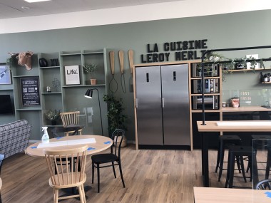A l’extérieur la cour matériaux est assez classique hormis ce parking qui en surplombe une partie. A noter un compacteur en arrière cour pour une gestion plus écolo des transports des déchets. La nouveauté se situe plutôt côté personnel avec un escalier truffé de références historiques au passé de l’enseigne. En haut surprise, c’est aussi beau que dans la partie expo du magasin. C’est sûr que le salarié qui arrive ici peut ressentir comme une certaine considération. Il y a une cuisine façon coloc d’étudiants, des zones de détente, de « zénitude », des bureaux d’entretien etc. Une architecte d’intérieur a donné à chaque pièce une touche particulière et locale. Si on aperçoit la mer au loin il n’y a en revanche pas de vue depuis cette passerelle sur l’intérieur du magasin. « je préfère qu’on descende voir ce qui s’y passe plutôt que de rester en haut à regarder si on a besoin », explique un Aurélien Chantrait qui n’attend plus qu’une chose : vérifier que les réglages de ce magasin moyen format trouve … son public