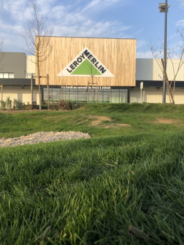 Ce magasin couvre environ 8 000 m2 donc 4000 m² en plus pour la cour matériaux. À noter la présence d’un parking de l’étage au-dessus de la cour matériaux une nouvelle façon de faire baisser l’emprise au sol sans perdre de place de stationnement. Sinon l’autre méthode passe par des places engazonnées. Il est vrai qu’ici on a le droit à un parking mêlant terrasse en bois et micro collines avec de l’herbe. C’est chaleureux avec bien entendu les bornes de recharge de véhicules électriques et sur le toit qui reste dispos des panneaux photovoltaïques.