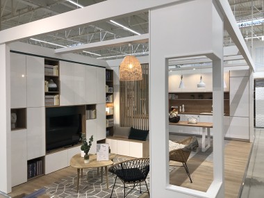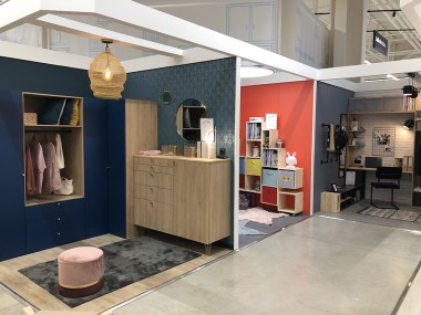 Inspiration toujours quelques mètres plus loin avec, toujours à droite, un véritable salon d’exposition sur 400 m avec salles de bains, chambre, suite parentale, rangement, placard et cuisine et du coup les deux ensemble. En fait autour de ce poumon d’expo « maison » s’articulent un atelier conception salle de bains, des « utilitaires » produits puis un atelier conception commun au rangement et à la cuisine. Ça c’est nouveau ! Ce n’est pas troublant car depuis l’expo on repère facilement les rayons correspondants. .