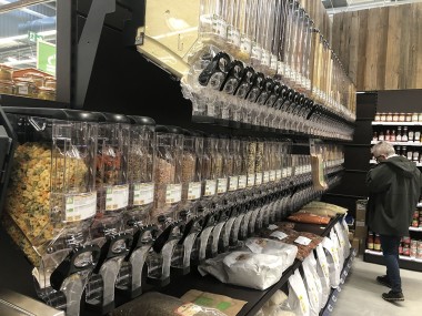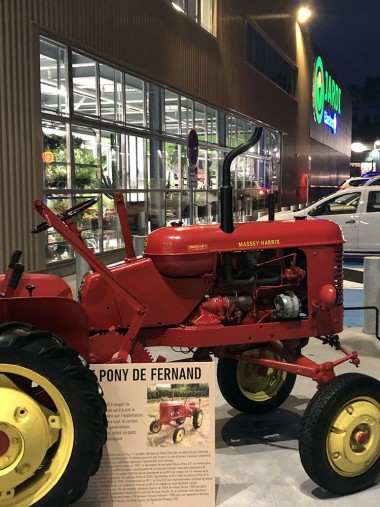 L’architecture en acier présente sur un côté des flancs ajourés permettant d’apercevoir la jardinerie, les plantes etc. La face avant dispose elle aussi d’un vitrage géant, une vitrine attractive. Le magasin est rythmé par l’exposition d’ outils anciens témoins de l’activité viticole locale. Les vignes, notamment de Sauternes, sont à quelques encâblures. Dès l’entrée un joli tracteur Massey-Harris. C’est le Pony de Fernand nous indique un panneau. Ce genre de clin d’œil touche les habitants du coin qui ont tous un grand-père ou un grand-oncle qui avait le même. Un lien local mis en valeur aussi par une innovation totale : le P’tit marché. Une sorte de magasin dans le magasin qui met en avant la production locale. C’est pas du brico mais bien de l’alimentaire placé en entrant à droite, dans la zone jardinerie du point de vente. Nous sommes entre le « Frais d’ici » de Gamm Vert et le marché bio de Botanic . D’ailleurs la signature de cette nouvelle enseigne résume tout : « Local . Bio ., Frais » On y retrouve des distributeurs de pâtes et autres riz en vrac, du « boeuf de Bazas », des légumes et du vin. Une vingtaine d’entreprises locales fournit les étals… Le pain lui aussi est le fait d’une boulangerie artisanale