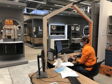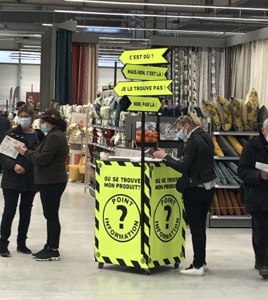 En tête de gondole, on retrouve des grappes de multiprises, façon Brico Dépôt. La zone EPI et ses masques... sans oublier la Découpe.