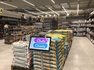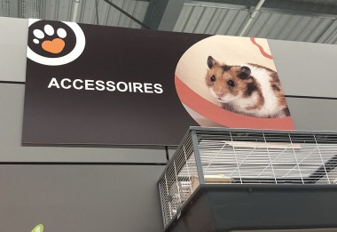 L’enseigne Nos Animaux occupe une vaste zone du magasin avec force petfood, oisellerie, rongeurs vivants. La signalétique de l’enseigne est reprise mais agrémentée de photos