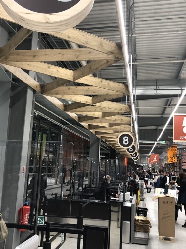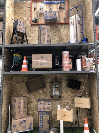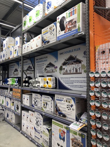 La zone bricolage est la parfaite traduction du slogan « Inspirer et réaliser ». En entrant dans le magasin par l’allée centrale tout ce qui est à votre droite inspire et les rayons de gauche permettent de réaliser. Ainsi, en avançant, nous avons sur main droite les luminaires mis en scène, tout comme l’encadrement et la déco tandis qu’à gauche les rayons sont dédiés à la peinture et à la plomberie. Virage à gauche de 90 ° et là sur 50 m, à droite s’exposent les revêtements de sols, les salles de bains, cuisine, escaliers, portes… A gauche tout ce qu’il faut pour installer tout cela avec une zone quincaillerie, électricité. A noter d’ailleurs que la zone électrique est géante !